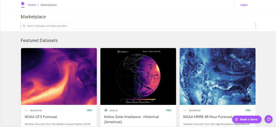 Earthmover Data Marketplace es un espacio que ofrece distintos datasets meteorológicos, de clima y de observación terrestre, listos para uso en la nube y proveídos por fuentes como ECMWF, NOAA y otras de pronósticos basados en IA