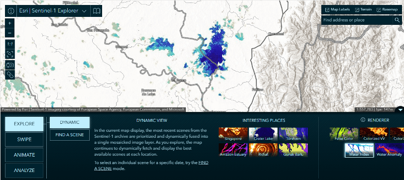 Desde 2024 está disponible la plataforma Sentinel-1 Explorer, herramienta de ESRI para navegar y analizar escenas multitemporales de Sentinel-1, un sistema radar de apertura sintética, SAR, de la ESA y la Comisión Europea. Comprende imágenes desde 2014. Por sus características es útil especialmente para aplicaciones marinas, mapeo de inundaciones, derrames de petróleo, entre otras.