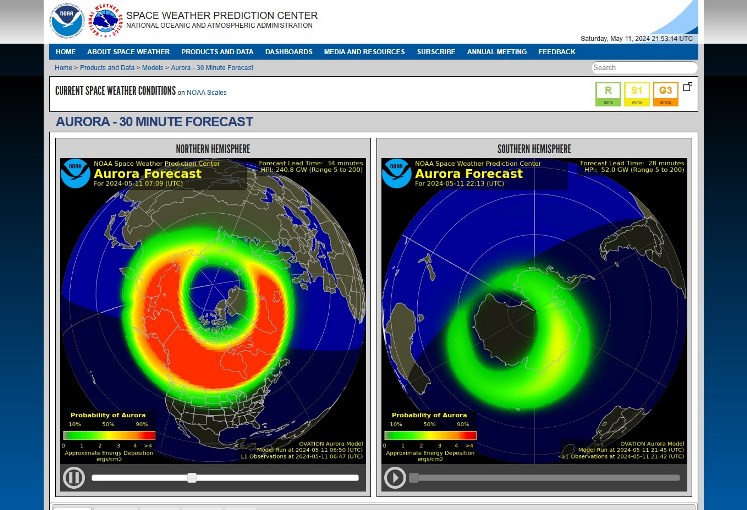 El Space Weather Prediction Center, SWPC, es parte de la Oficina Nacional de Administración Oceánica y Atmosférica, NOAA y entre la información que divulga relacionada con auroras y alertas del clima espacial figura: