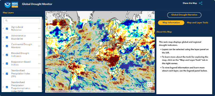 Sistema global de información sobre sequía, GDIS, es un desarrollo de la NOAA que provee datos mundiales de este fenómeno y su relación con los recursos agrícolas