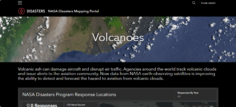 El Portal de Mapeo de Desastres de la NASA dispone de un dashboard con una pestaña dedicada a volcanes y una sección con más recursos y galerías de productos relacionados con eventos específicos