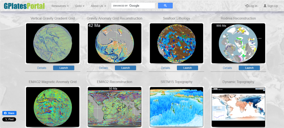 GPlates es un desarrollo de EarthByte y dispone en su portal de una diversidad de recursos sobre información geológica global. Entre estos figuran fallas, anomalías magnéticas, litología, gradientes gravitacionales, placas tectónicas y más.