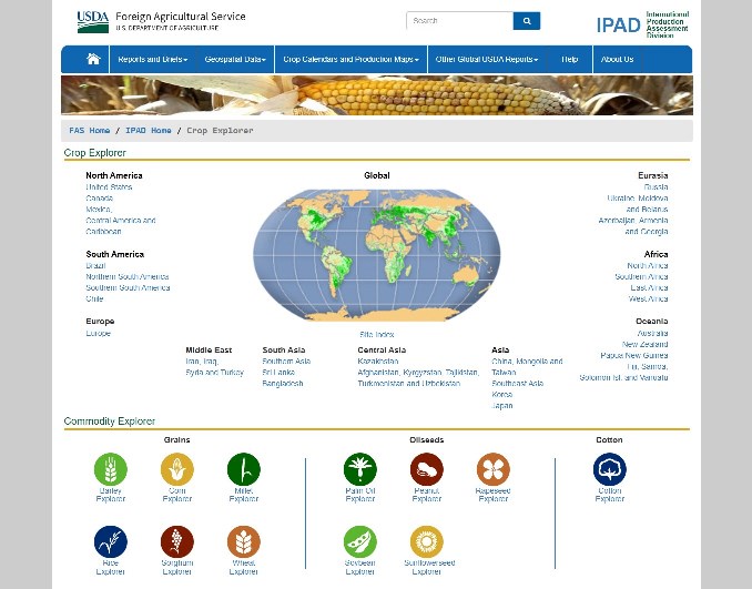 Servicio del Departamento de Agricultura de los Estados Unidos, USDA, que permite la visualización geográfica y consulta de estadísticas de cultivos a nivel global y por país productor