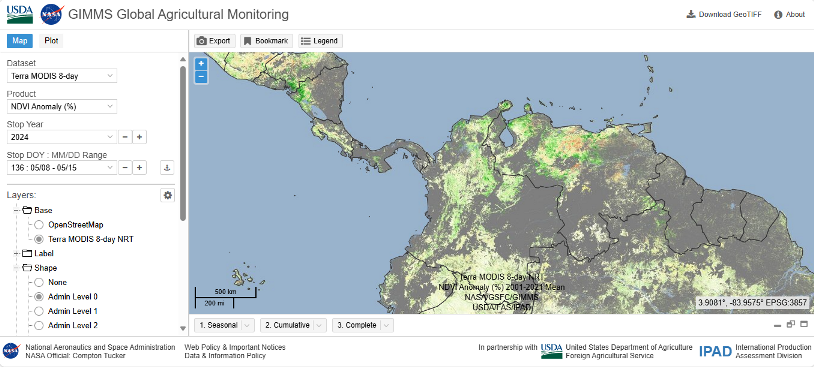En este visor de USDA/NASA se puede visualizar y descargar escenas de índices de vegetación obtenidas por sensores como MODIS, VIIRS y otros, que son soporte al proyecto de Monitoreo global de agricultura, GLAM
