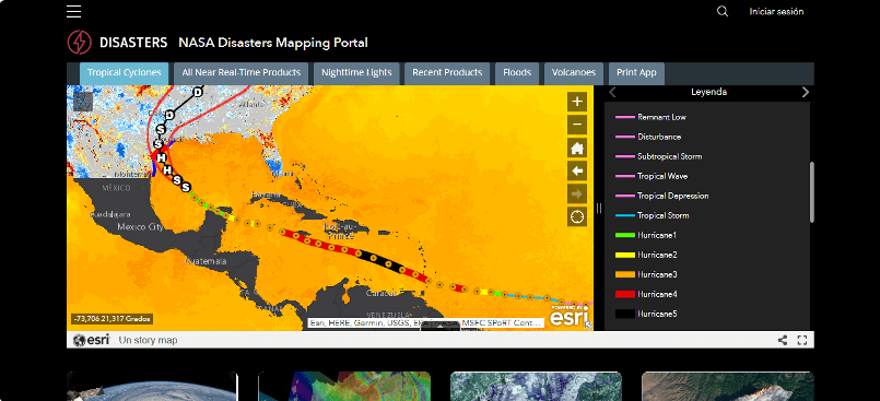 El Portal de Mapeo de Desastres de la NASA dispone de un dashboard con una pestaña dedicada a huracanes y ciclones y una sección con más recursos y galerías de productos relacionados con eventos específicos