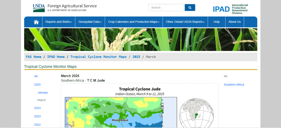 Geovisor de tormentas tropicales. Recurso de la International Production Assessment Division, IPAD, del Foreign Agricultural Service, FAS, de la USDA.