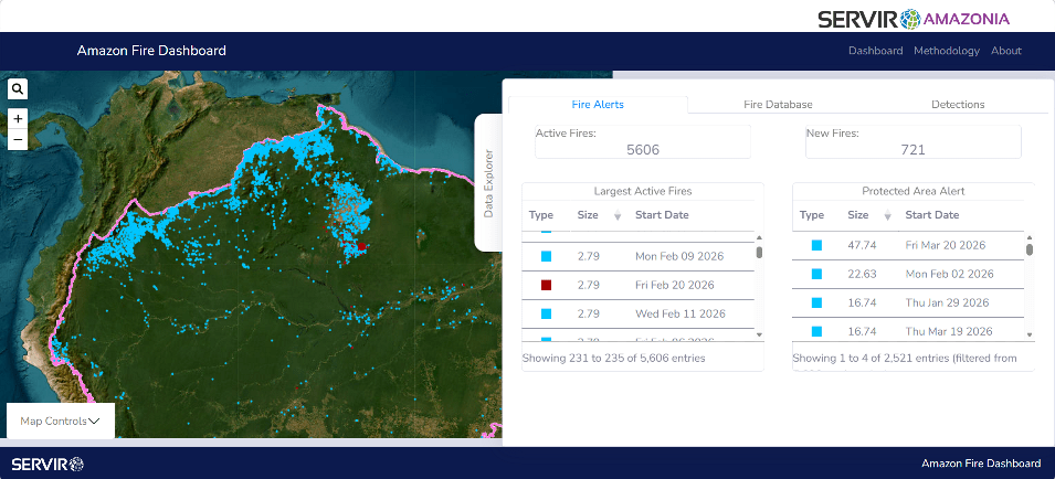 Amazon Fire Dashboard es un tablero de monitoreo de incendios en la Amazonía. Su base de datos incorpora incendios de deforestación, incendios de sotobosque, pequeños incendios de desmonte o agrícolas y quemas de sabanas y pastizales. La plataforma también señala alertas en áreas protegidas. Es un desarrollo SERVIR Global Collaborative, una red de instituciones regionales, universidades, fundaciones y agencias gubernamentales, que colaboran para desafíos ambientales y de desarrollo.