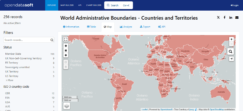 Capa muy generalizada de países y territorios proveída por Open Data Soft