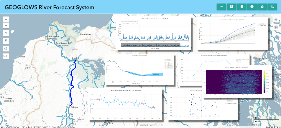 GEOGLOWS River Forecast System es una plataforma con pronósticos y estimados en retrospectiva para más de 7 millones de drenajes en el mundo. El sistema se vale de información del Integrated Forecast System (IFS) del ECMWF y elevación de TanDEM-X. En el geovisor se puede consultar cada segmento individual, se generan pronósticos para los próximos días y gráficos históricos en términos de promedio de descarga diaria y anual, volumen de descarga acumulada por año, curvas de volumen acumulado, promedio de flujo mensual, picos anuales de descarga, promedio de descarga diaria durante varias décadas y curvas de duración. Todos los datos descargables en CSV.