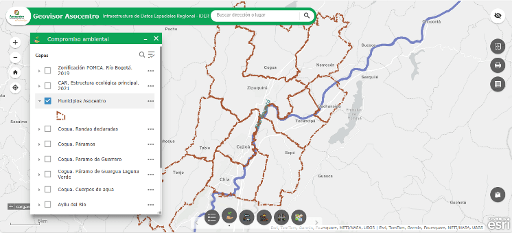 Geovisor IDER con los municipios que integran la Asociación de municipios de Sabana Centro (Cogua, Nemocón, Zipaquirá, Tabio, Tenjo, Cajicá, Chía, Gachancipá, Tocancipá y Sopó).
