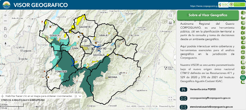 Herramienta pública de la Corporación Autónoma Regional del Guavio, CORPOGUAVIO. Permite consulta e interacción de información espacial relevante en la planificación territorial de la jurisdicción de la entidad.
