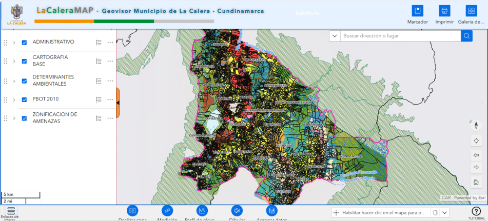 Geovisor del municipio de La Calera. Despliega información base, administrativa, de POT, determinantes ambientales, zonificación de amenazas, entre otros.