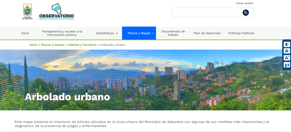 Geovisor del Arbolado Urbano del municipio de Sabaneta, Antioquia, disponible en EcoSabaneta, Observatorio Ambiental del municipio. Proyecto de la Secretaría de Planeación y Desarrollo Territorial – Subdirección de Sistemas de Información y Estadística.
