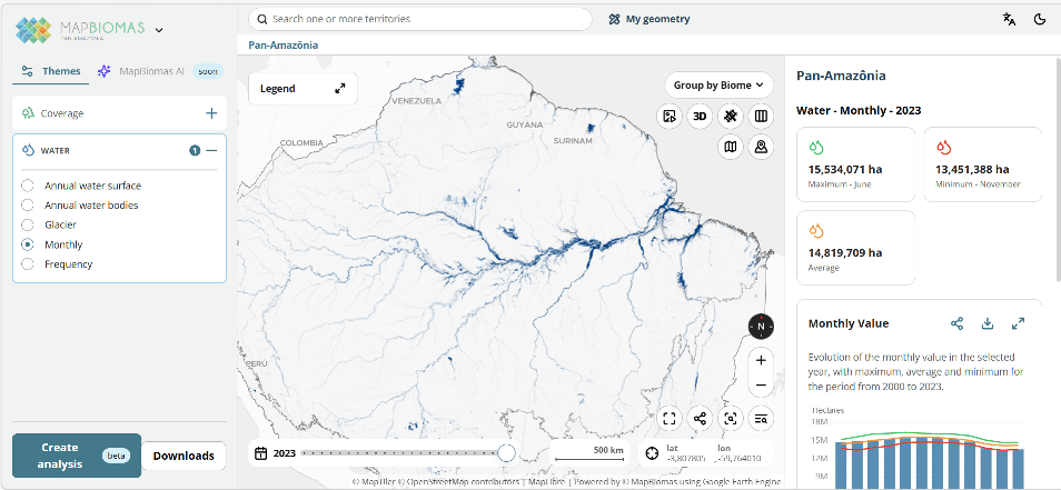 La colección 2 de MapBiomas Amazonía sobre agua presenta datos sobre superficies de agua, sus transiciones y tendencias para series del 2000 a 2023. Datos consolidados a partir de escenas Landsat