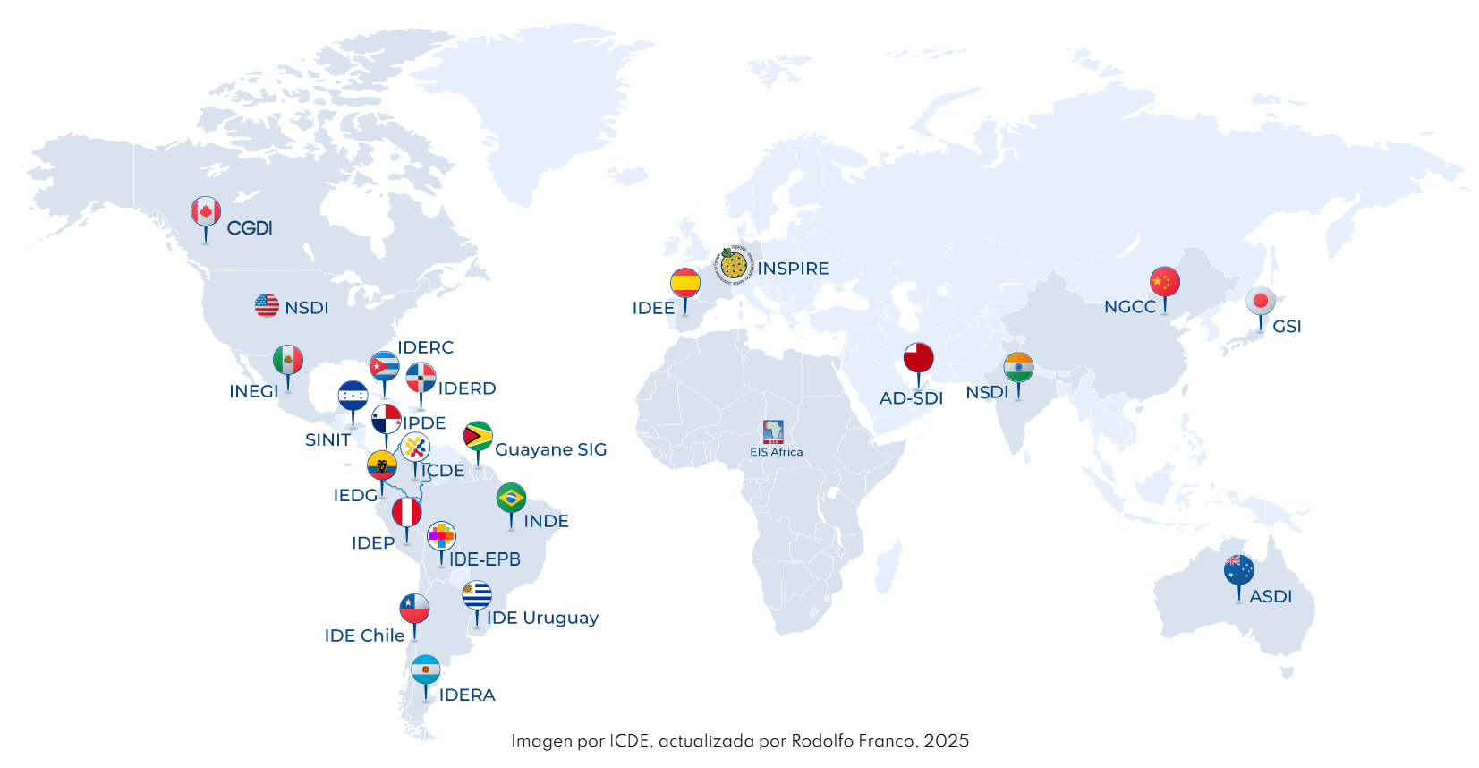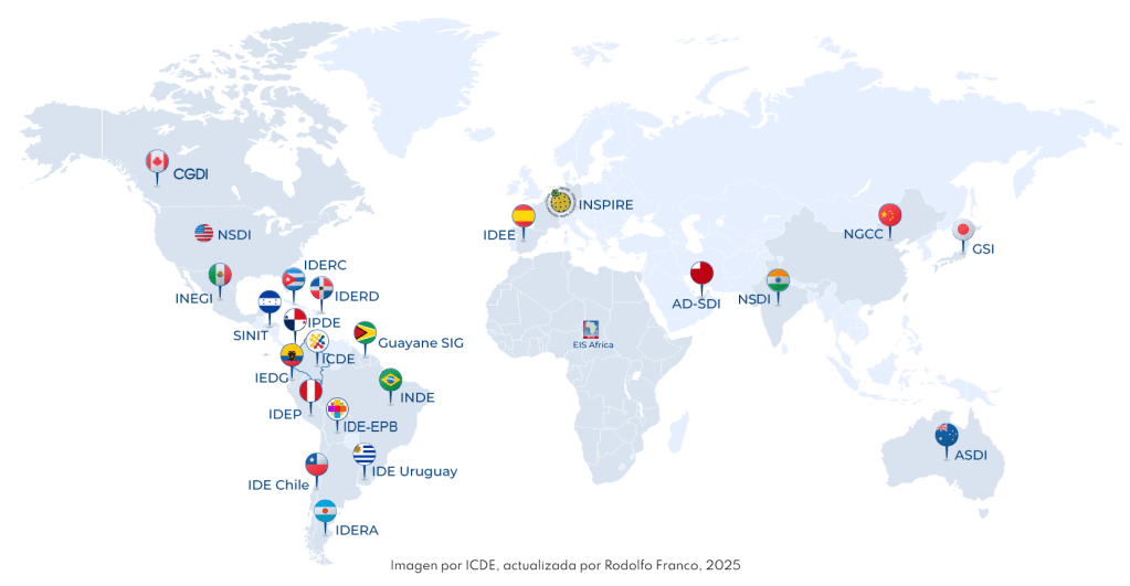 Mientras que para el país se habla concretamente de la Infraestructura Colombiana de datos espaciales, ICDE, para el resto del mundo se tienen varias instancias equivalentes como las que se relacionan a continuación: