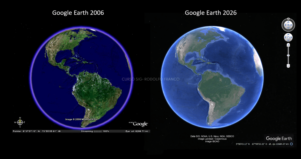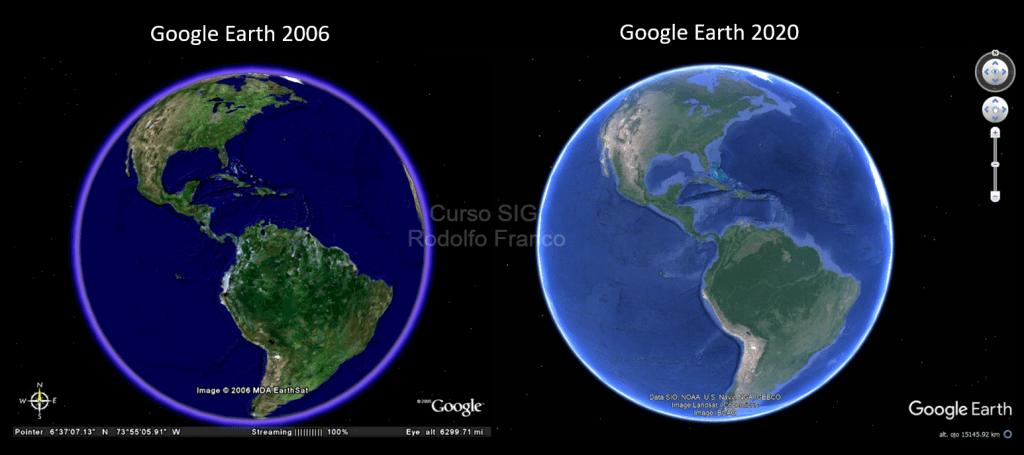 Para el Siglo XXI el primer hecho revolucionario lo constituyó la aparición de Google Earth. Comenzó en 2001 con el nombre de Earth Viewer 3D desarrollado por la compañía Keyhole hasta que ésta fue adquirida por Google en 2004, que luego haría el lanzamiento de la primera versión de Google Earth en mayo de 2005. Comenzó mostrando mosaicos de imágenes satelitales de nuestro planeta de diferentes fuentes cada vez con más resolución y hoy en día muestra hasta visión batimétrica, astronómica e histórica.