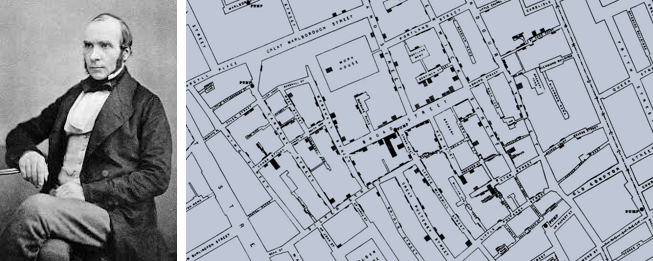 Otro caso que no puede faltar en la historia de análisis geográficos es el de John Snow (1813-1858), padre de la epidemiología, quien en 1854 estudió la relación de proximidad tanto en distancia como en tiempo entre casos de cólera y fuentes de agua contaminada en Londres.