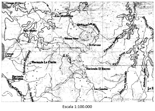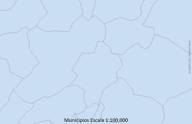 Las diferencias de escala no solo son notorias en cartografía análoga sino también en información digital. En la siguiente comparación se puede apreciar una capa de municipios obtenida a una fuente 1:100.000 versus 1:25.000. Son los mismos elementos, pero los contornos de estos polígonos en la versión 1:25.000 muestran más vértices:
