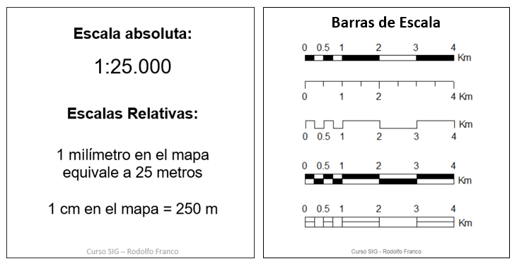 La escala se puede representar como una expresión absoluta, mediante una expresión relativa o mediante una barra con medidas. En la escala relativa se indica explícitamente la equivalencia mientras que con la escala de barra se muestra la proporción de forma gráfica directamente en el mapa.