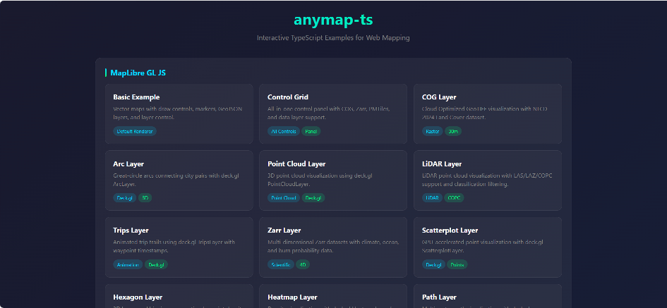 En Anymap-ts se pueden ver varios ejemplos ilustrativos de representaciones de datos espaciales empleando librerías de MapLibre GL JS