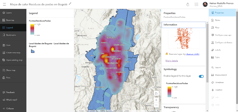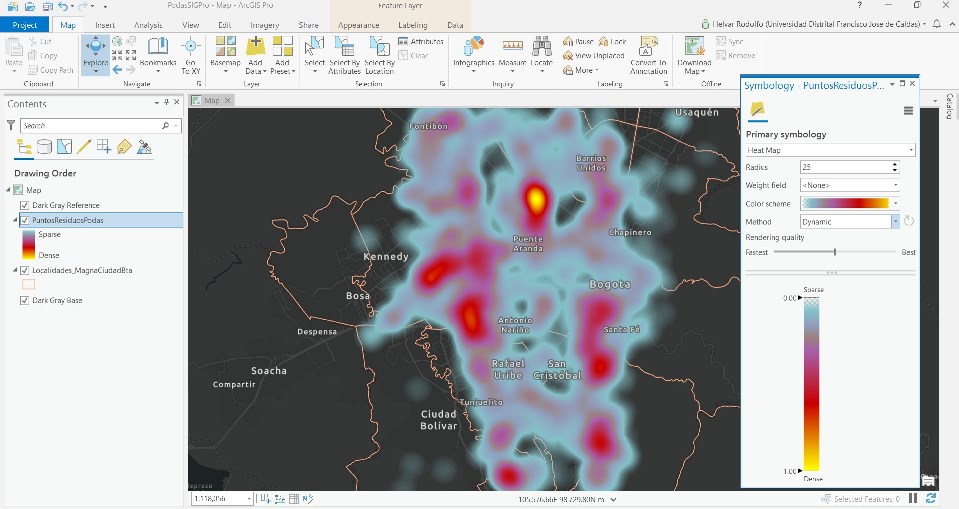 La simbología mapa de calor genera gradientes de color en función a la densidad de elementos puntos de una capa.