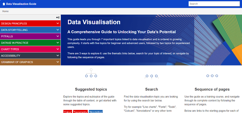 Esta es una amigable guía del portal de datos de la Unión Europea que ofrece orientación sobre: teoría del color, tipografía, herramientas de visualización, formatos de datos, historias con datos (storytelling), anotaciones de texto, tipos de gráficos y problemas comunes en estadísticas y visualización (pitfalls).