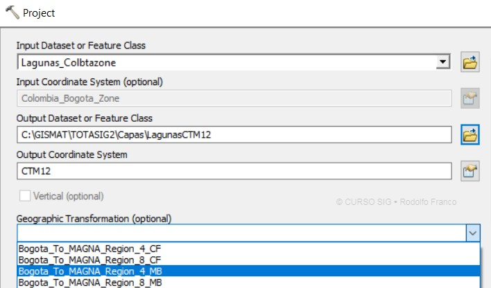 La transformación se puede realizar mediante el método de los siete parámetros también conocido como método marco de coordenadas (coordinate frame) o por el método Molodensky-Badekas, éste último se desarrolla en función a las coordenadas del punto central del área y es más refinado en la medida que involucra tres parámetros adicionales. Software como ArcGis incorporan entre sus opciones de transformación ambos métodos tal como se muestra en la siguiente imagen de ejemplo: