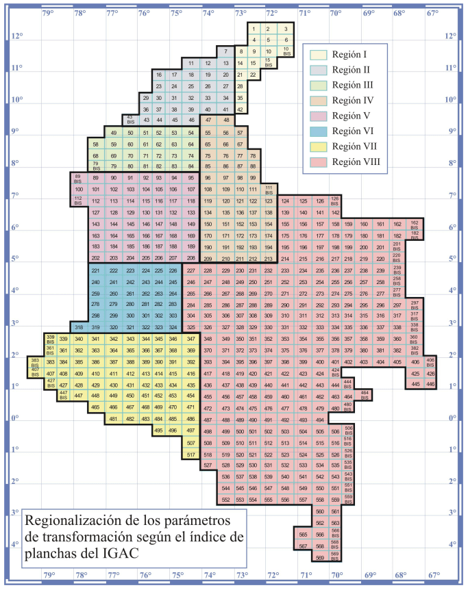 Para facilitar y minimizar el error en la transformación entre coordenadas en datum Bogotá al datum Magna-Sirgas, el IGAC dividió el territorio nacional en ocho regiones de acuerdo al comportamiento geoidal de las mismas y calculó parámetros de transformación para cada una. Esta regionalización se reflejó en un mapa publicado por esta institución en 2004: