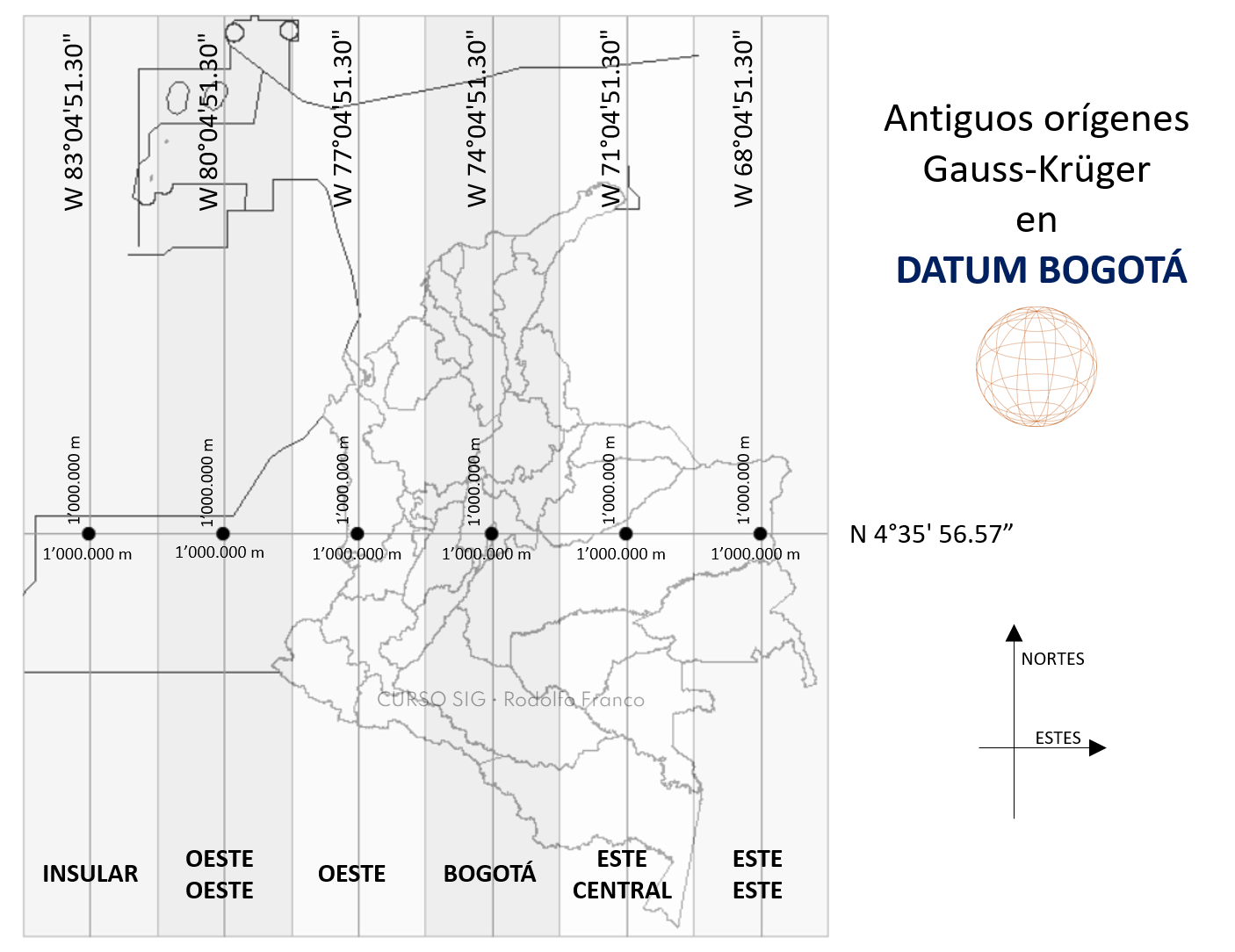 Antes del actual sistema MAGNA-SIRGAS Origen-Nacional y del anterior sistema MAGNA-SIRGAS de seis orígenes, el país usaba un sistema coordenadas proyectadas con base en el llamado Datum Bogotá. A continuación, una breve síntesis: