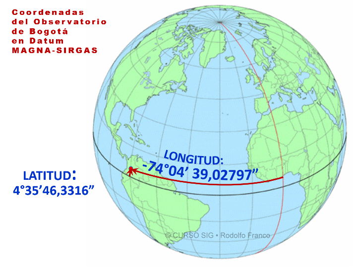 Por supuesto, una información que esté ligada al viejo datum va a presentar un desplazamiento frente a información en el Datum MAGNA-SIRGAS precisamente por el uso de esferoides distintos. Como ejemplo se muestra en las siguientes figuras las coordenadas del viejo Observatorio Astronómico de Bogotá en el Datum antiguo o Datum Bogotá y en el Datum actual, aunque la diferencia son pocos segundos de arco, su equivalente en terreno son varios centenares de metros.