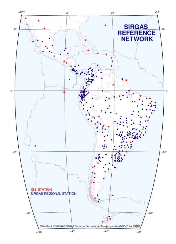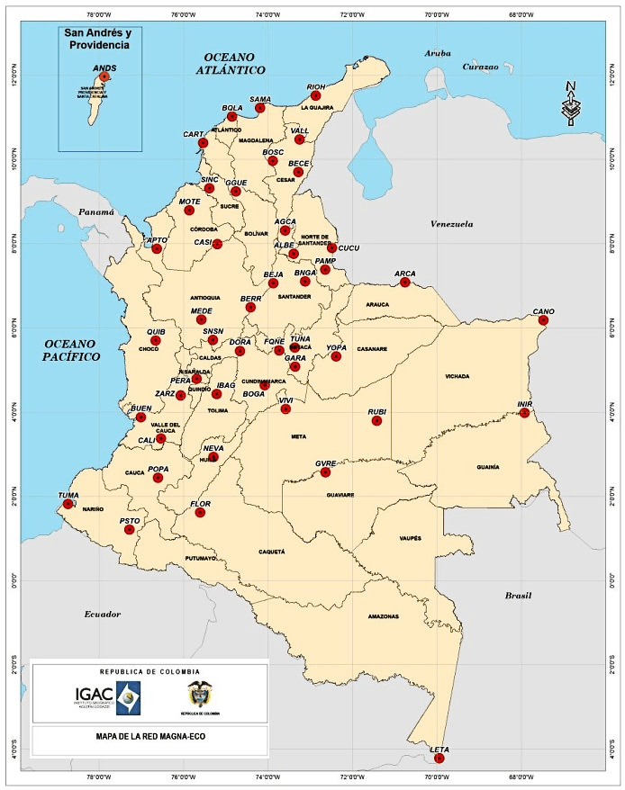 Colombia utiliza el Datum MAGNA-SIRGAS (Marco Geocéntrico Nacional de Referencia) que es una densificación del Sistema de Referencia Geocéntrico para las Américas, (SIRGAS), este a su vez es una densificación del Marco de Referencia Internacional Terrestre (ITRF), y este último es una materialización del sistema global conocido como Sistema de Referencia Internacional Terrestre (ITRS). La materialización corresponde a una red de vértices geodésicos distribuidos sobre el planeta y que son monitoreados mediante sistema GPS – GNSS (Global Positioning System – Global Navigation Satellite Systems). El ITRF más reciente es el ITRF2020-u2023 y cuya descripción aparece en https://itrf.ign.fr/en/solutions/itrf2020-u2023